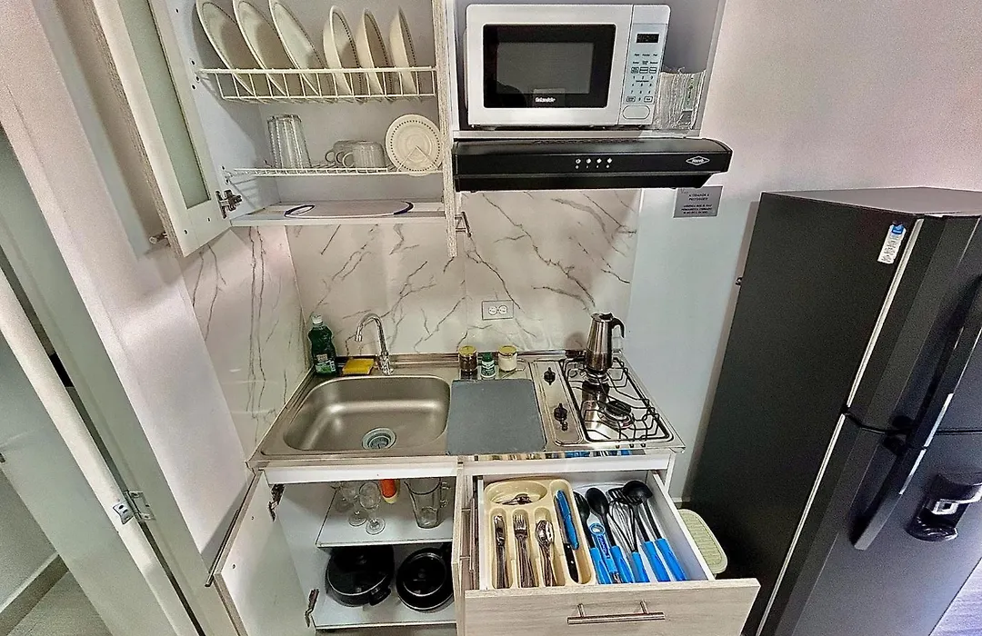 Disfruta de la comodidad de una cocina bien equipada en el Apartamento A109 con aire en el Poblado, permitiendo a los huéspedes preparar sus propias comidas caseras. La estación de metro Aguacatala está a unos minutos a pie del apartamento.
